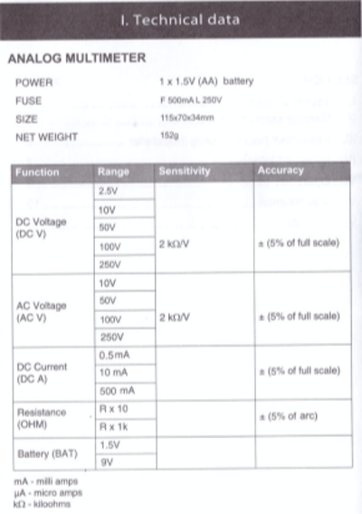 This is an scan of the specifications page of the All-Sun pocket multimeter sold at Canadian Tire.  It appears to be a All-Sun EM330B.          The sensitivity value for this meter is 2k-ohm per volt for AC and DC voltage measurements.